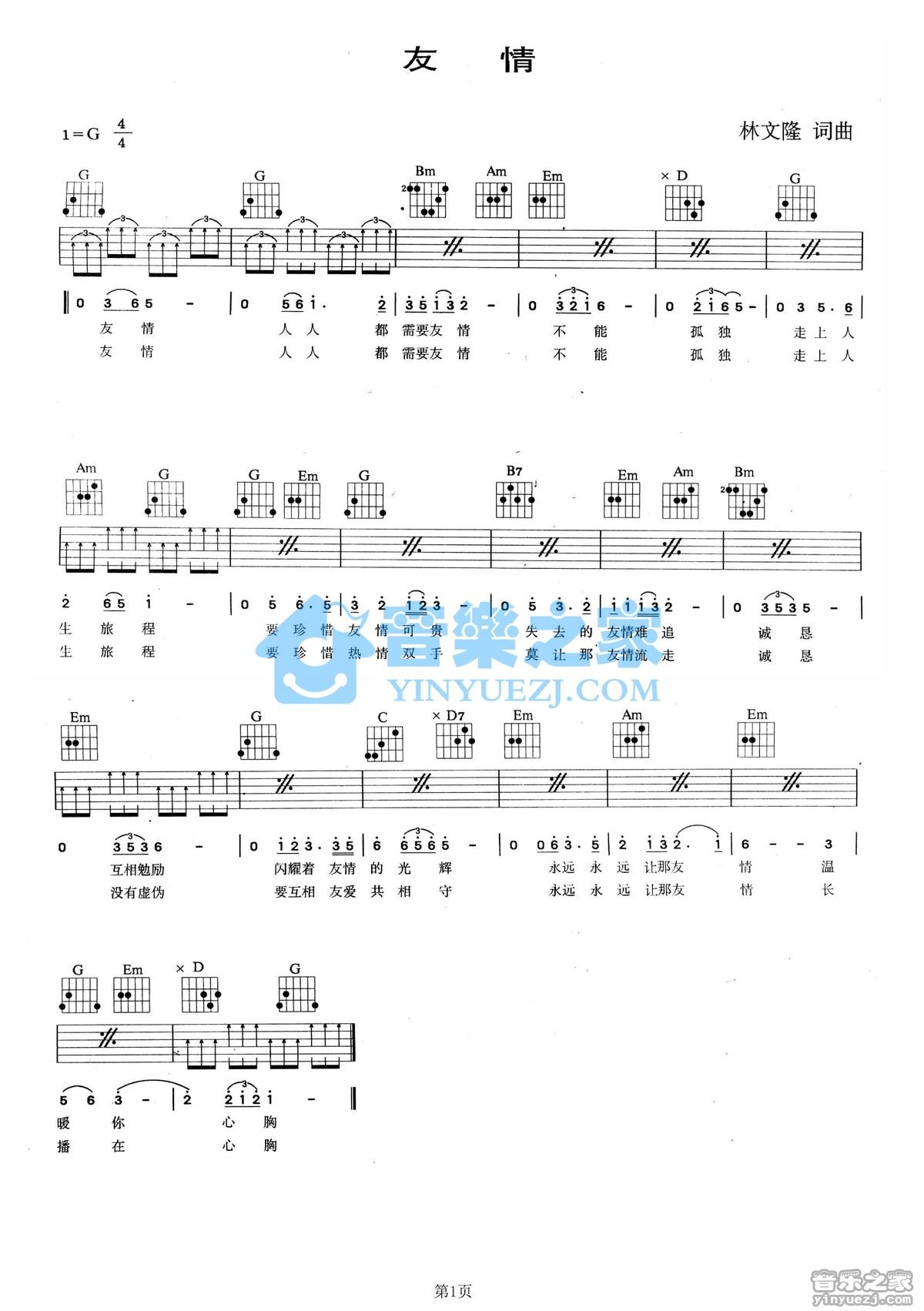 G调版余天《友情》吉他弹唱六线谱...