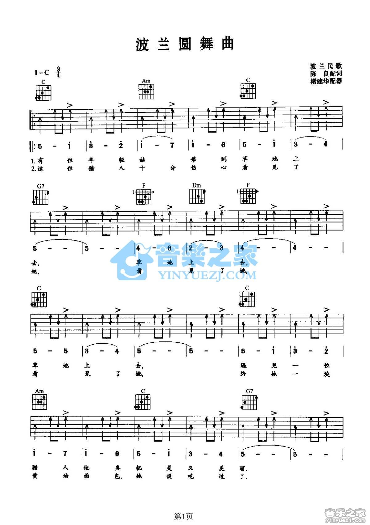 C调版波兰民歌《波兰圆舞曲》吉他弹唱六线谱...