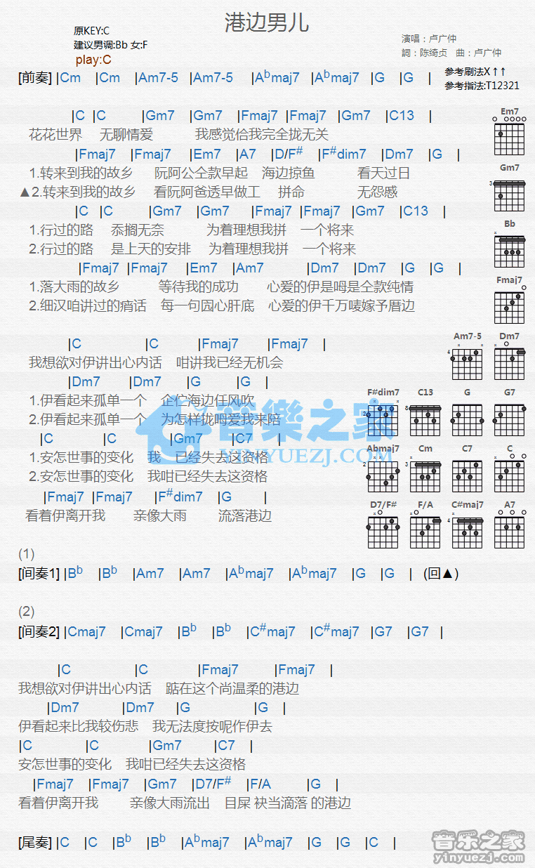 C调版卢广仲《港边男儿》吉他和弦弹唱谱...
