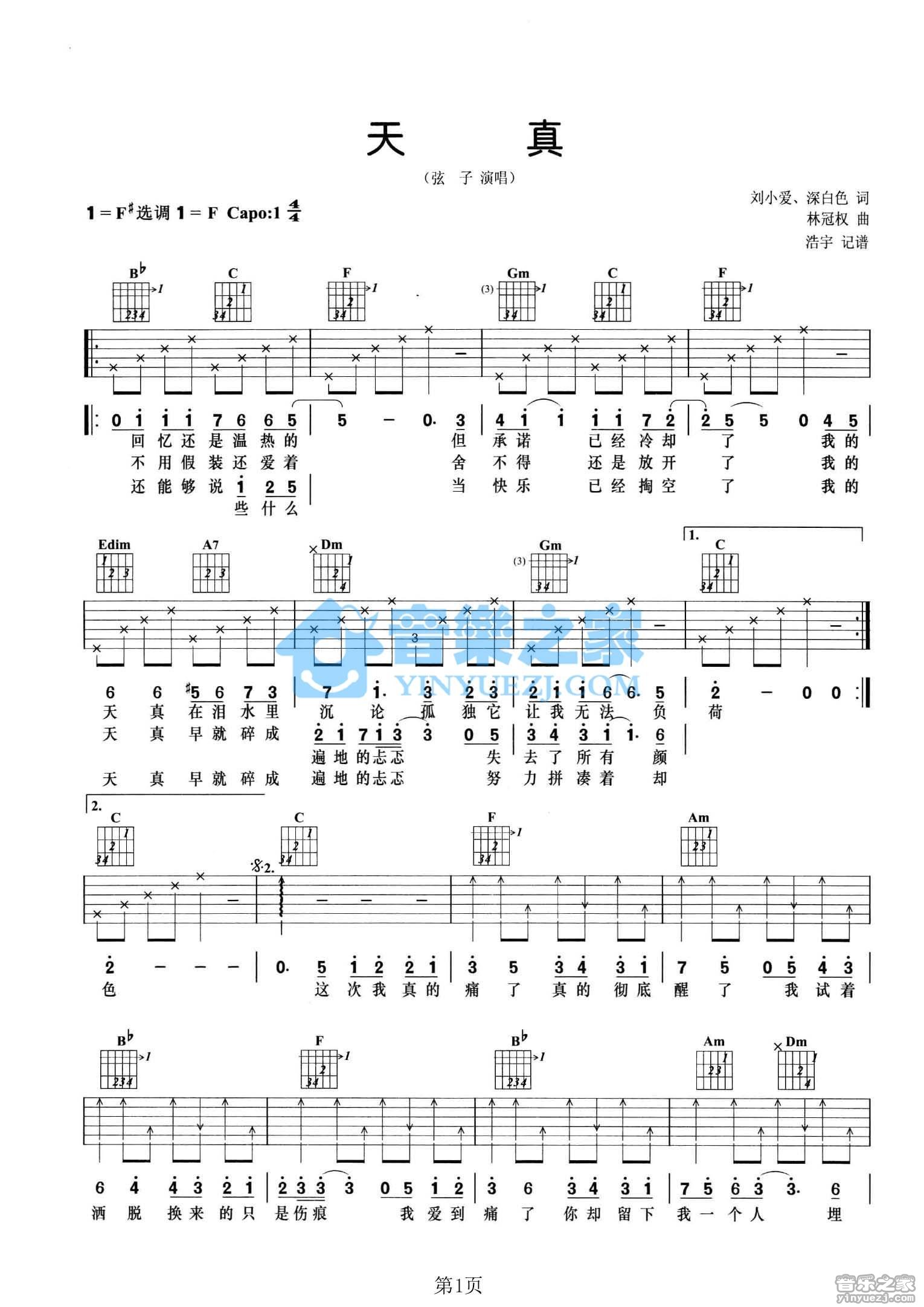 F调版弦子《天真》吉他弹唱六线谱...