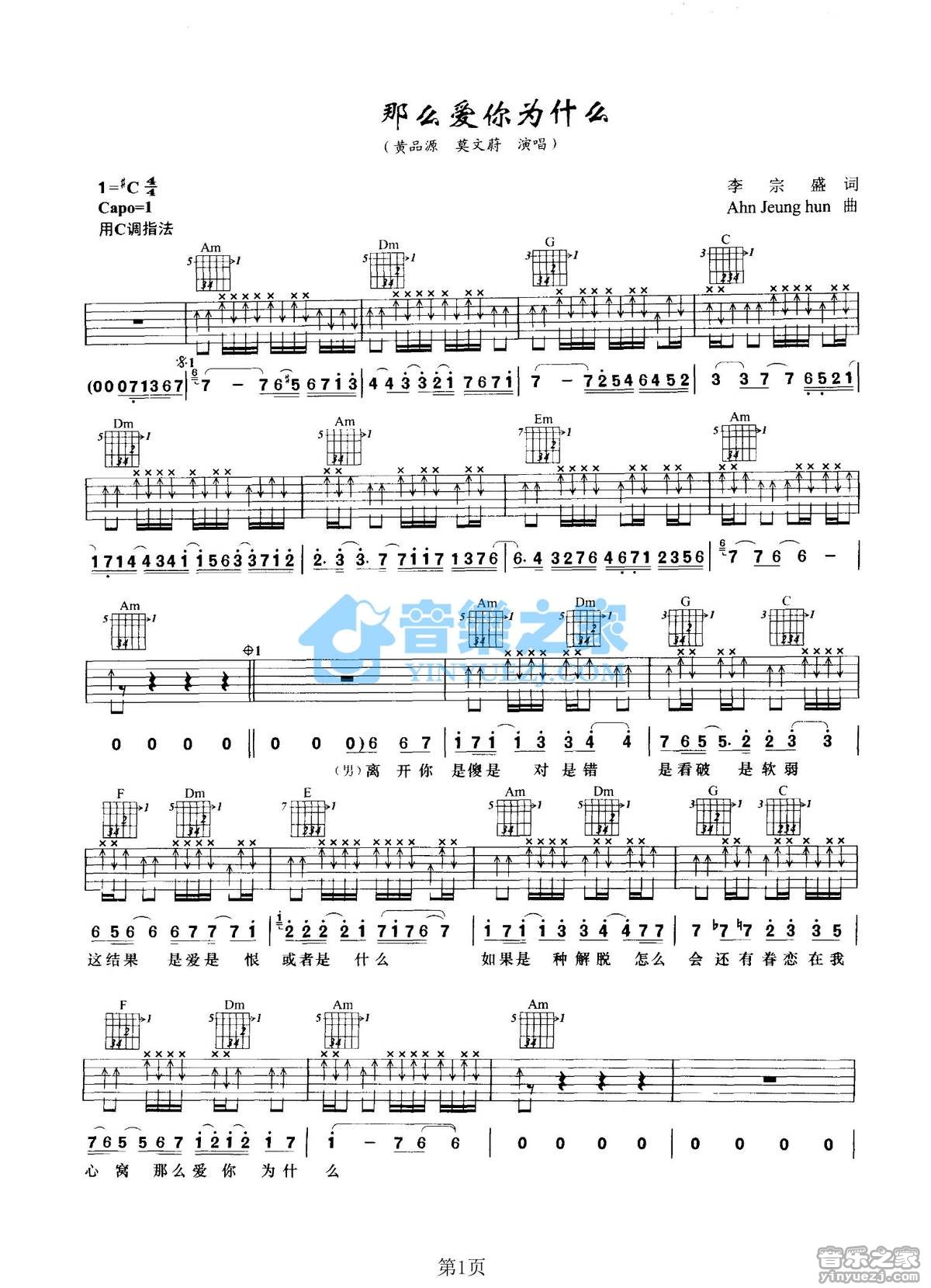 C调版黄品源/莫文蔚《那么爱你为什么》吉他弹唱六线谱...