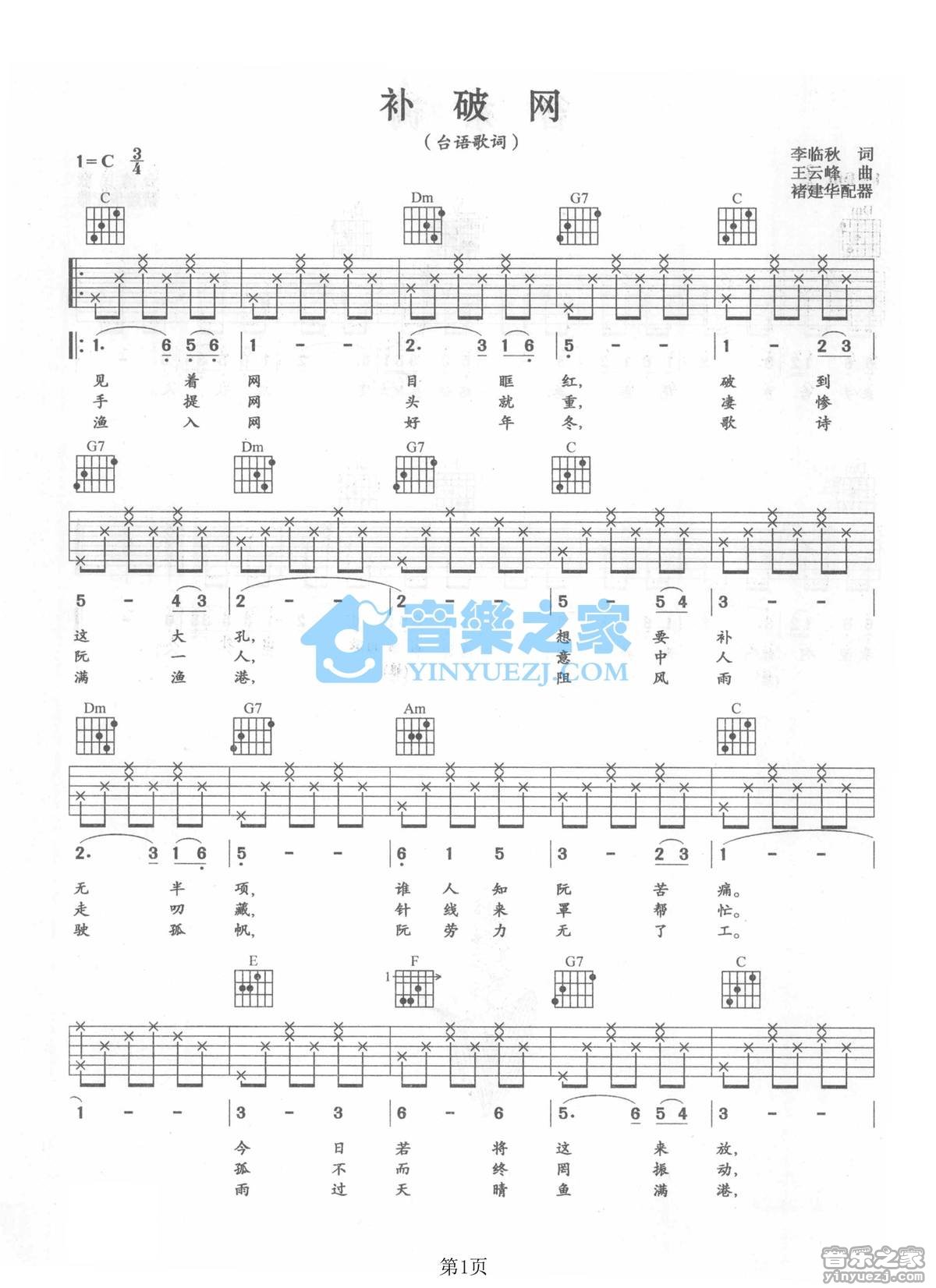 C调版蔡幸娟《补破网》吉他弹唱六线谱...
