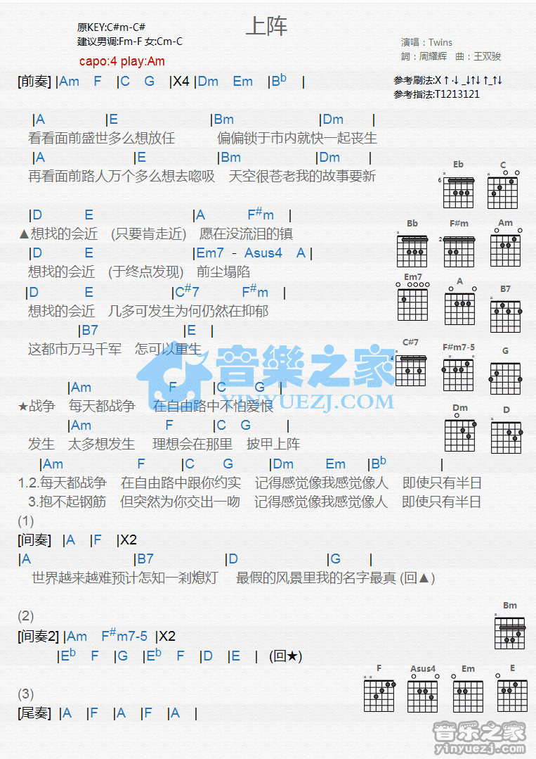 Am调版Twins《上阵》吉他和弦弹唱谱...