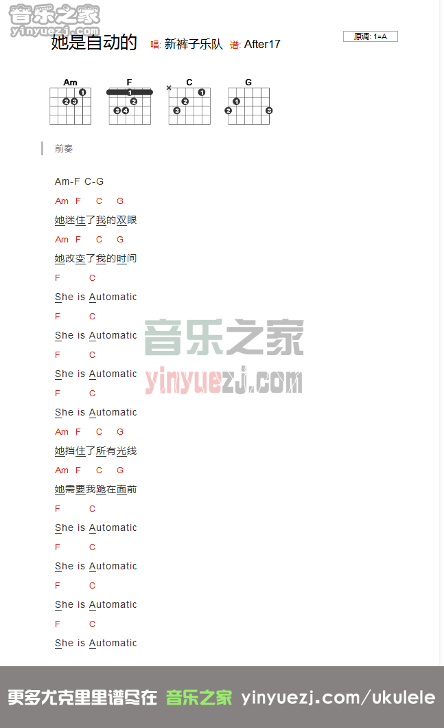 吉他新裤子乐队《她是自动的》吉他谱_吉他弹唱谱_YYZJ编配