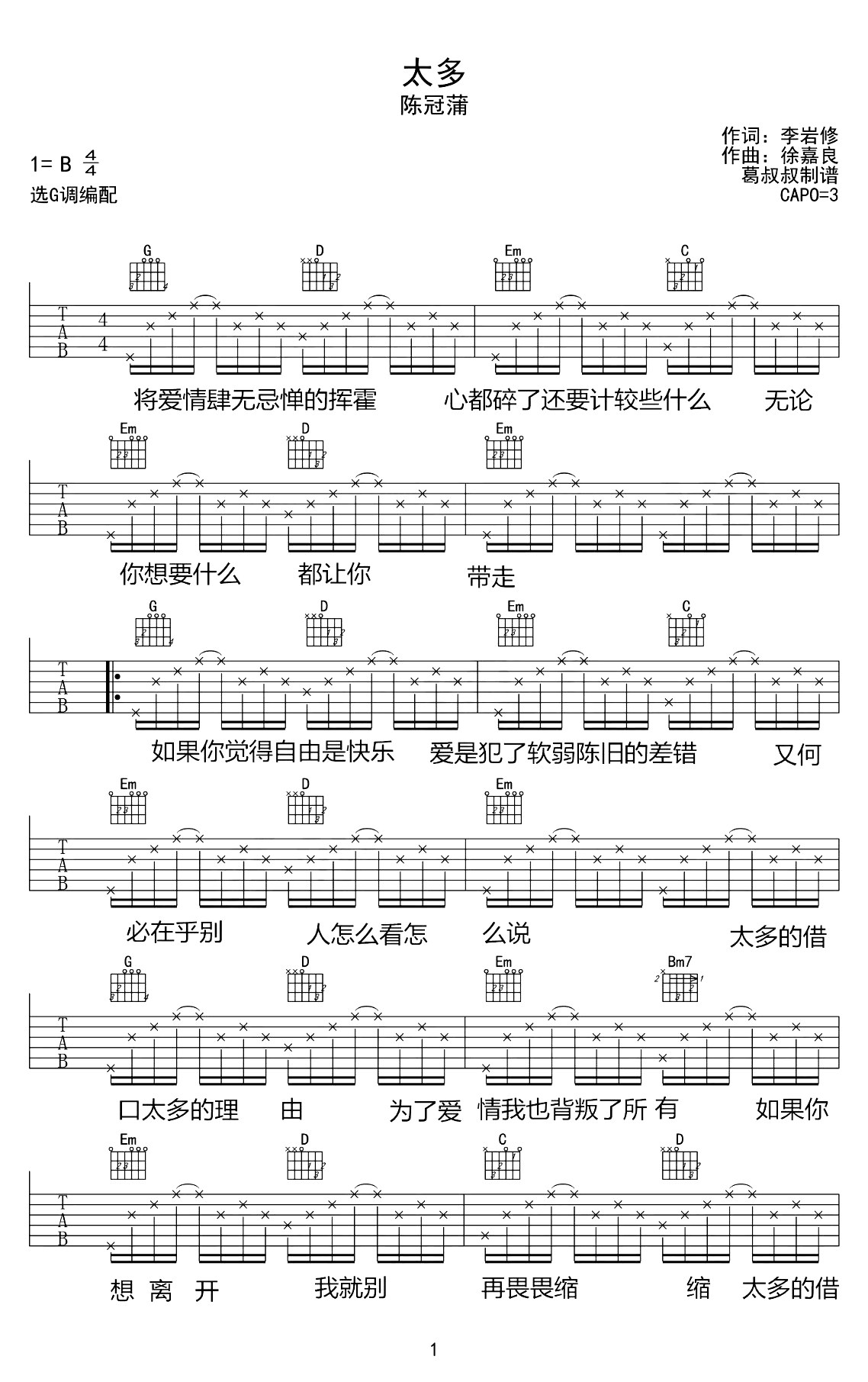吉他陈冠蒲《太多》吉他谱_吉他弹唱谱_葛叔叔编配