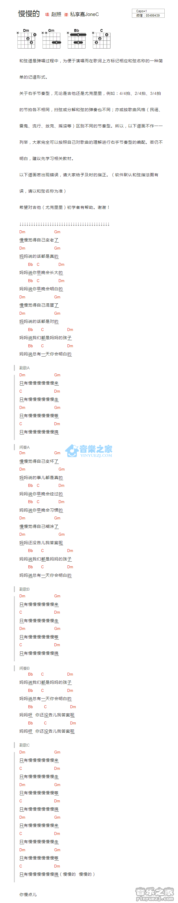 赵照《慢慢的》吉他和弦弹唱谱...