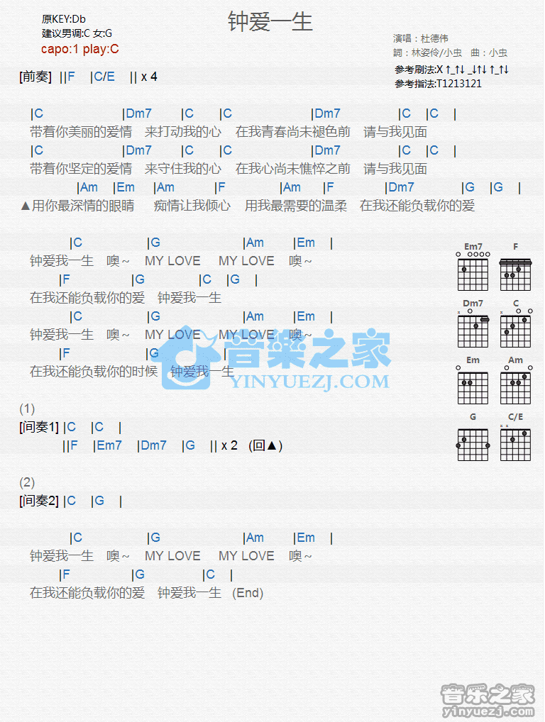 C调版杜德伟《钟爱一生》吉他和弦弹唱谱...