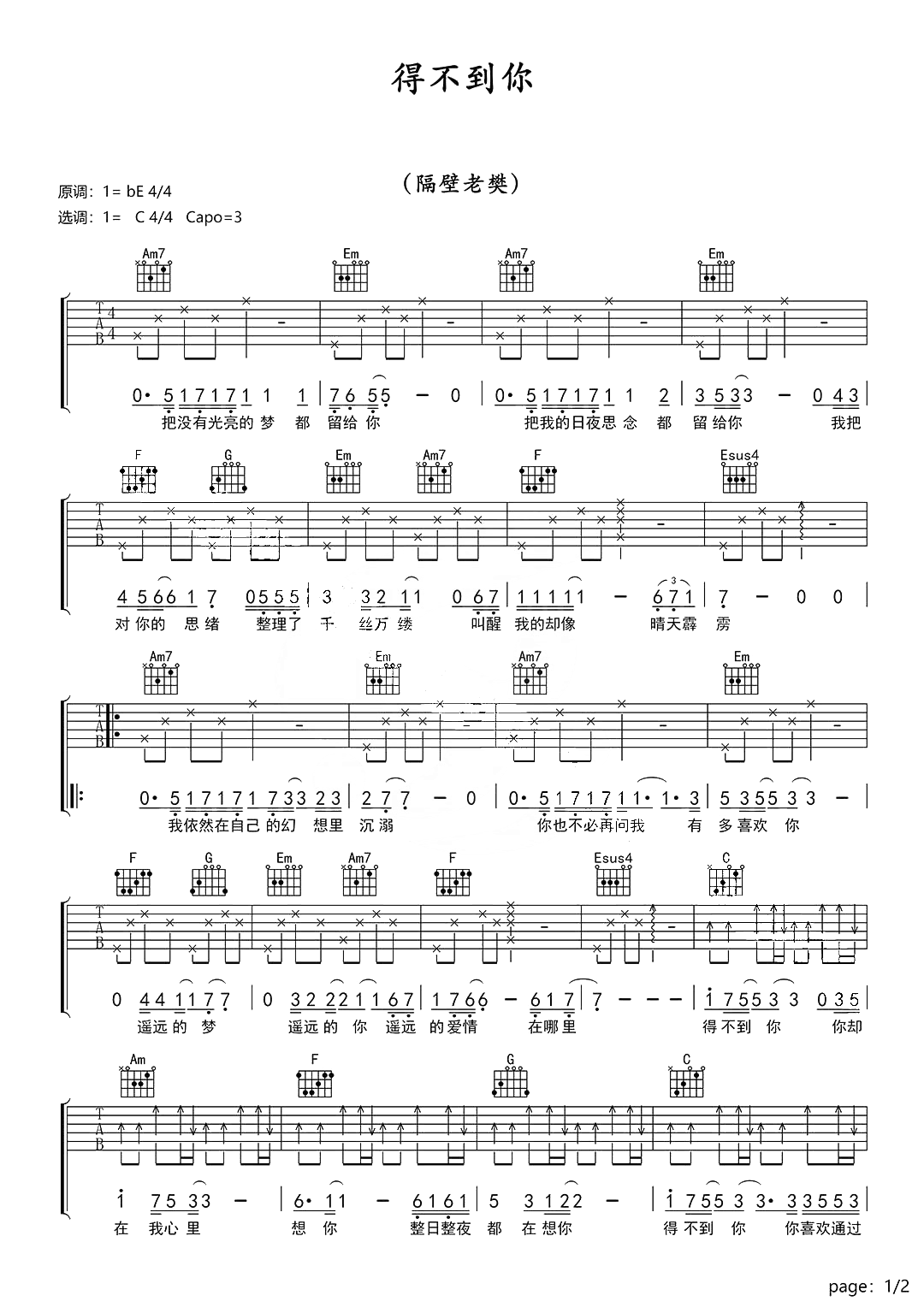 《得不到你》吉他谱,隔壁老樊的一首新歌单曲,原调bE,选调C,CAPO夹三品。等不到你六线谱,高清弹唱图片谱,乐事吉他编配,易唱网整理上传。随谱附上曲谱配套吉他弹唱教学视频。整首歌曲旋律治愈且轻柔,情绪忧郁但又不乏浪漫的色彩,让人不禁沉浸在爱情得与失的悲伤之中。...