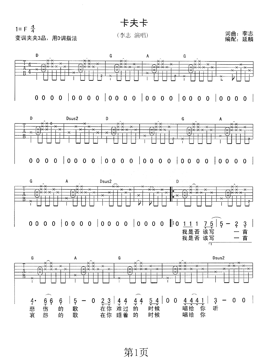 D调版李志《卡夫卡》吉他弹唱六线谱...
