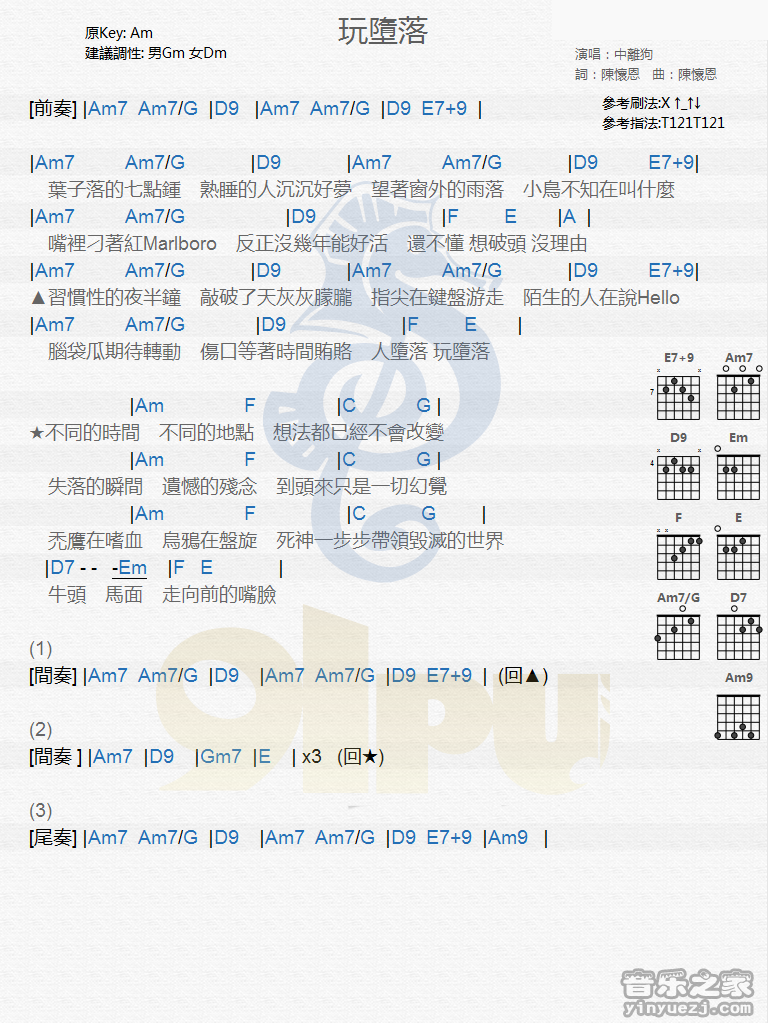 Am调版《玩堕落》吉他和弦弹唱谱...
