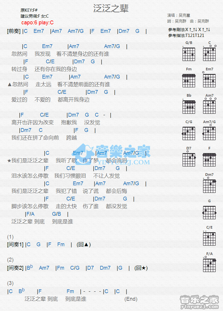 C调版吴克t《泛泛之辈》吉他和弦弹唱谱...