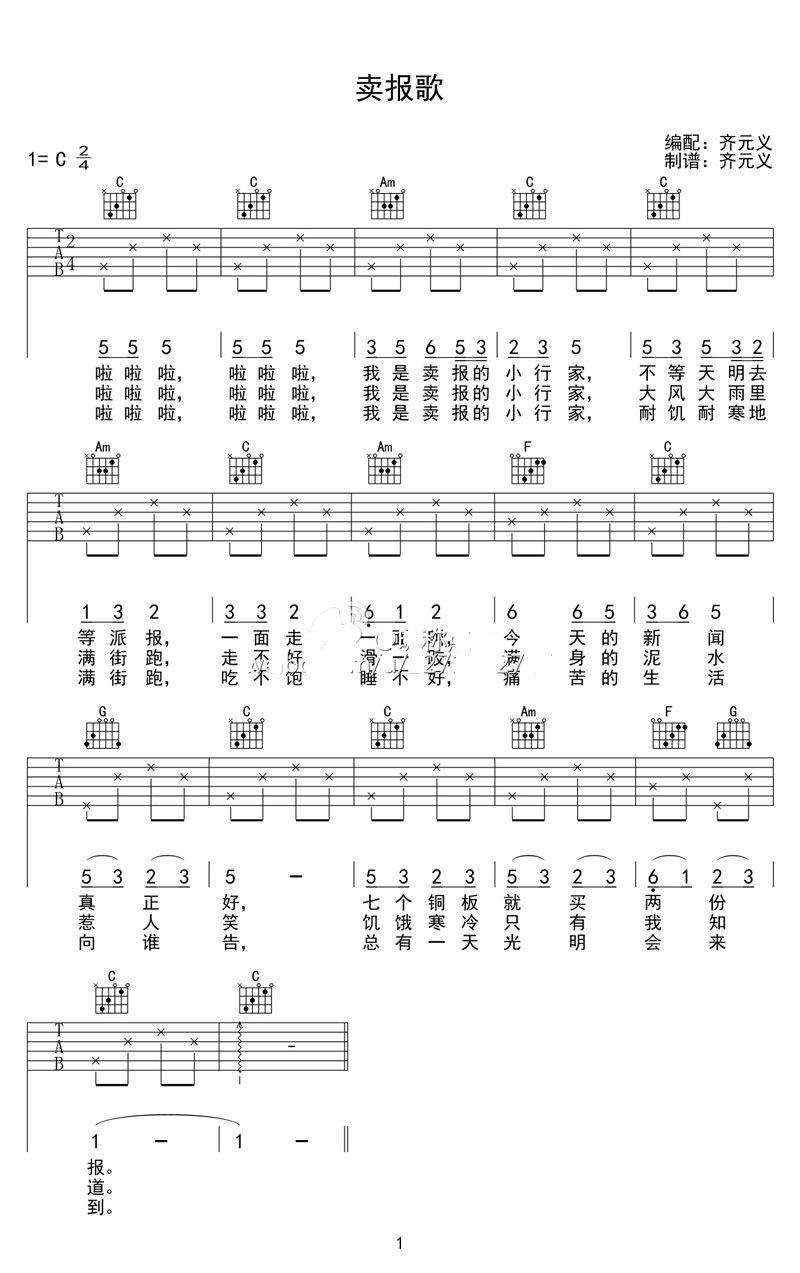 吉他《卖报歌》吉他谱_吉他弹唱谱_齐元义编配