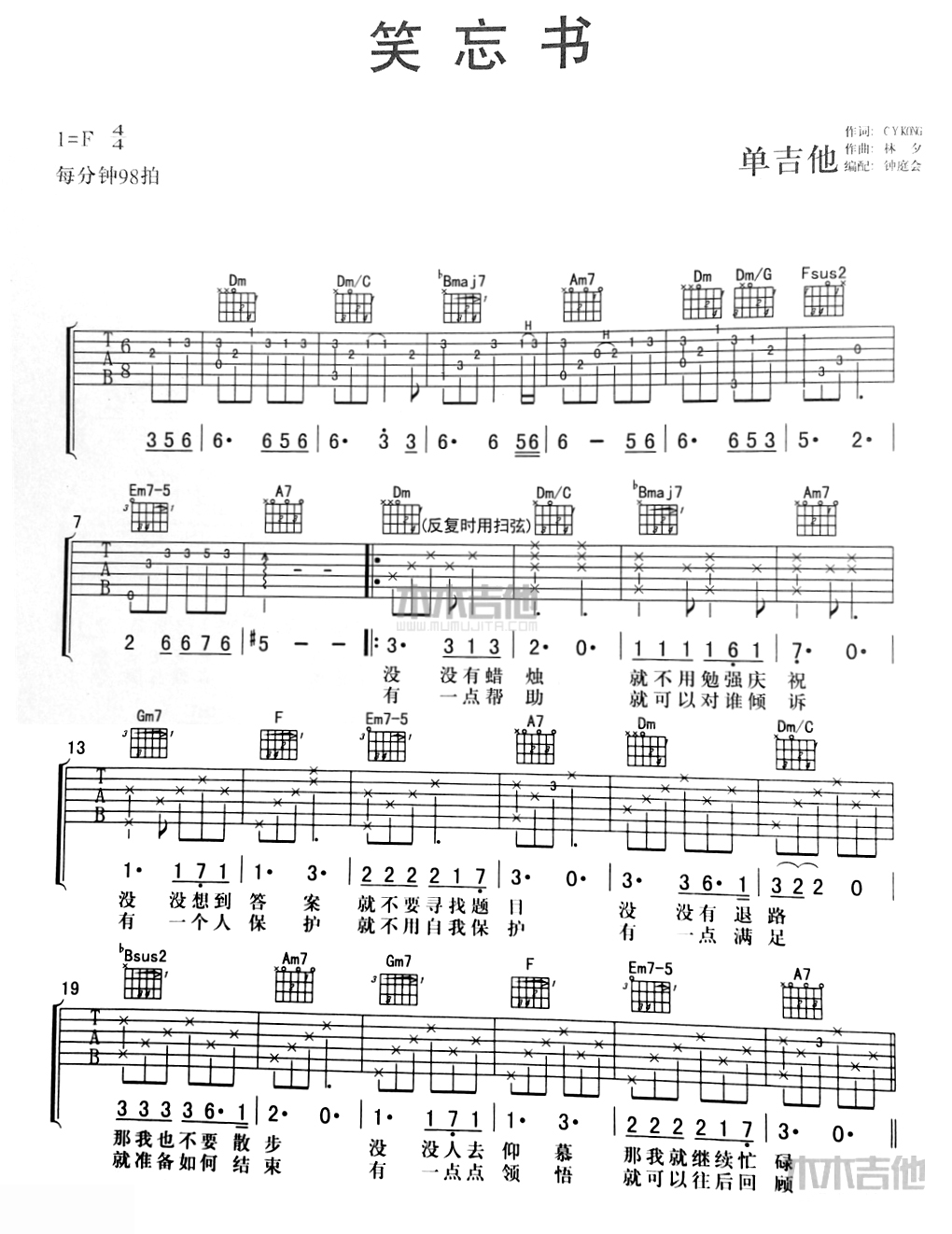 吉他李荣浩《笑忘书》吉他谱_吉他弹唱谱_木木吉他-钟庭会编配