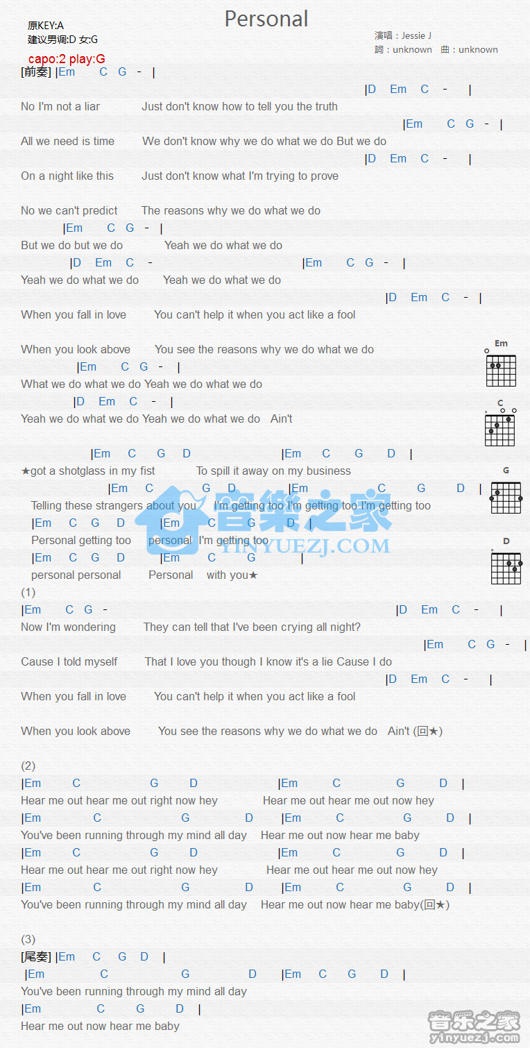 吉他JessieJ《Personal》吉他谱_吉他弹唱谱_YYZJ编配