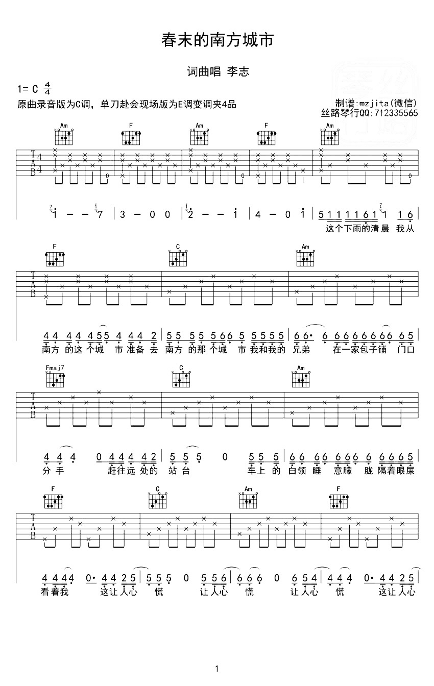 吉他李志《春末的南方城市》吉他谱_吉他弹唱谱_琴丝行路--mzjita编配