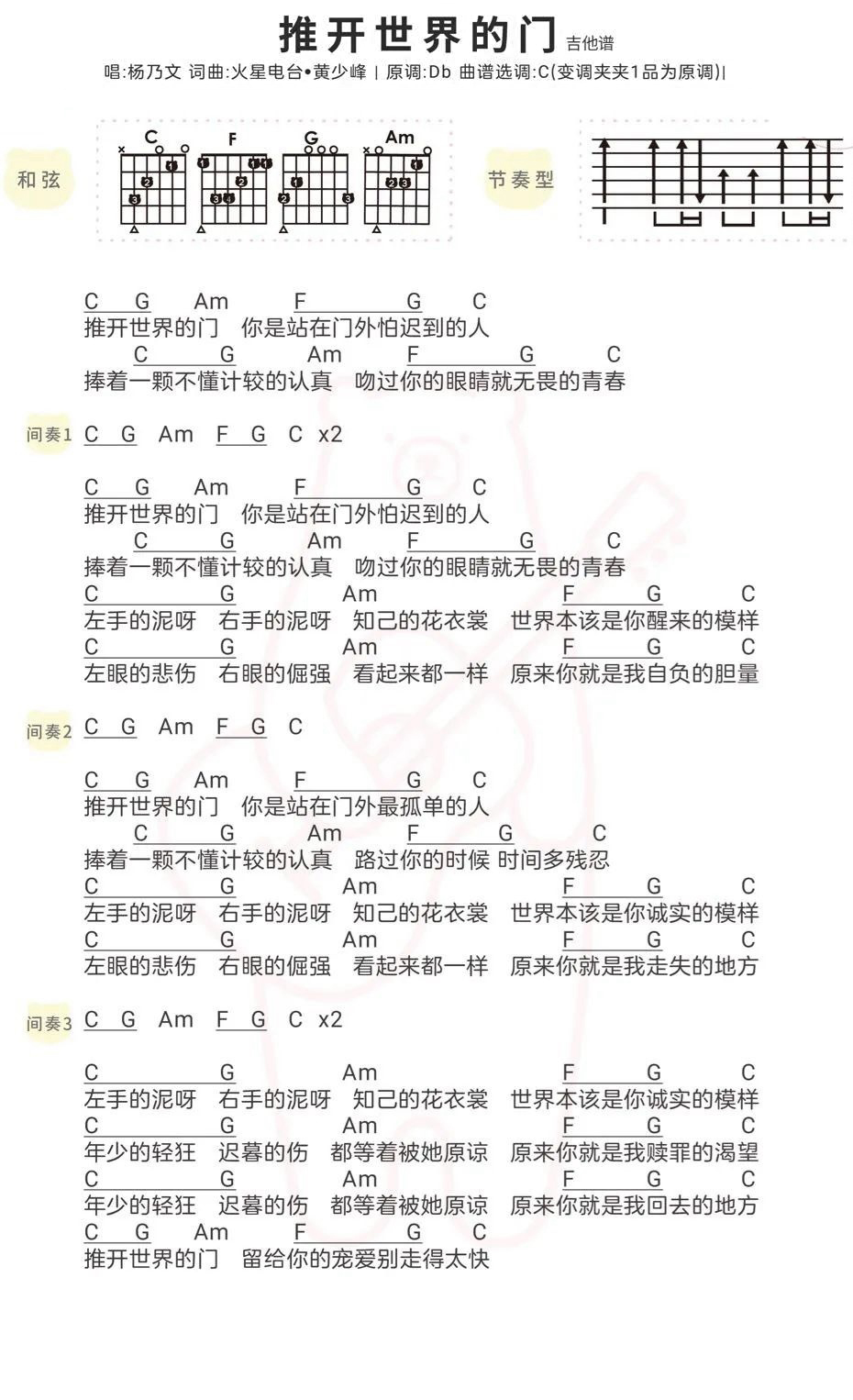 吉他杨乃文《推开世界的门》吉他谱_吉他弹唱谱_白熊音乐编配