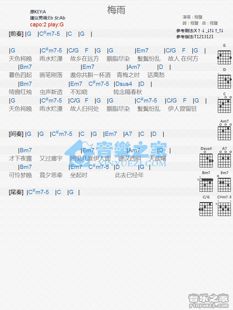 G调版程璧《梅雨》吉他和弦弹唱谱...