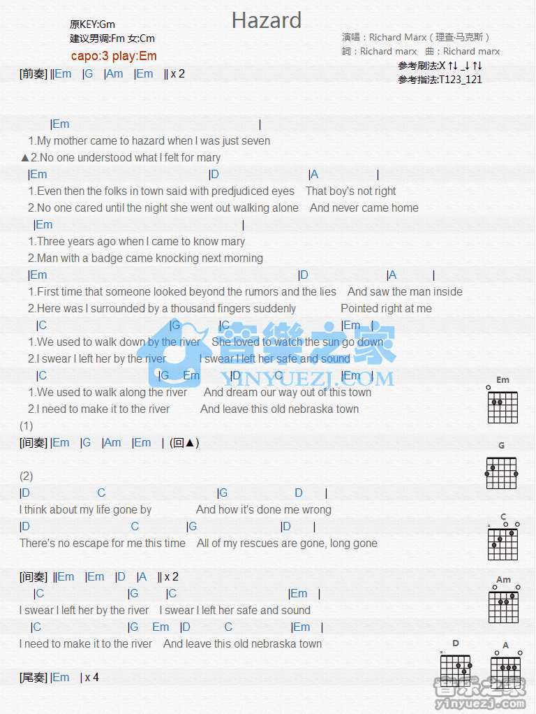 Em调版RichardMarx《Hazard》吉他和弦弹唱谱...