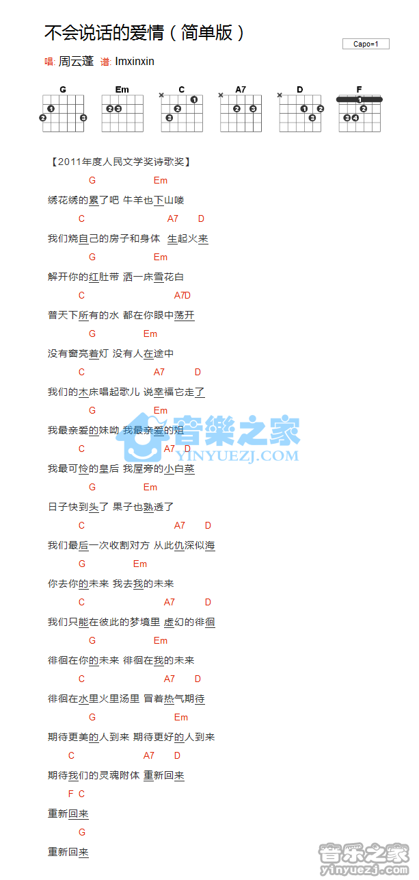 简单版周云蓬《不会说话的爱情》吉他和弦弹唱谱...