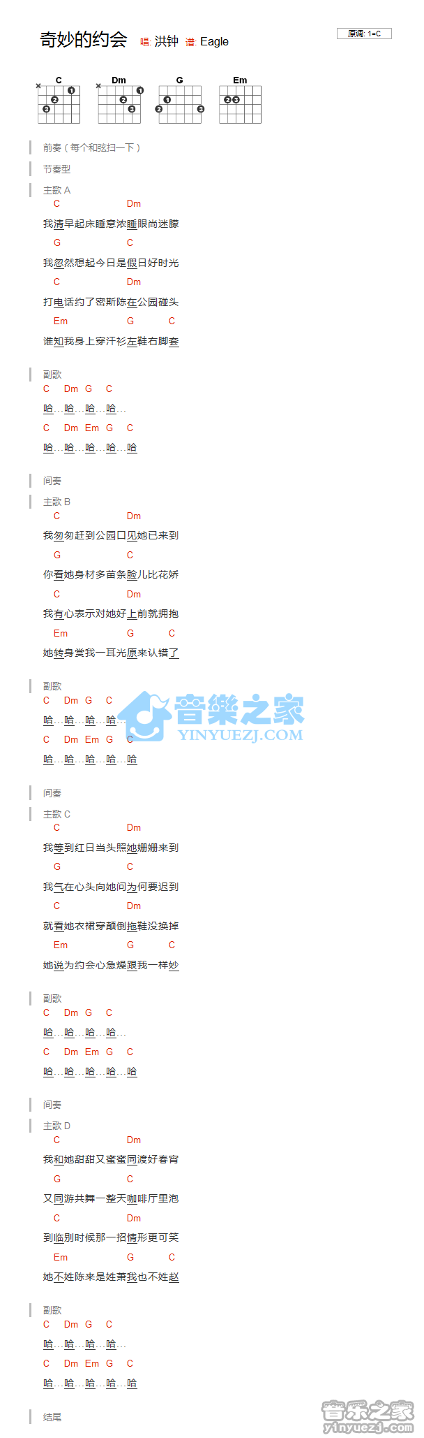 吉他洪钟《奇妙的约会》吉他谱_吉他弹唱谱_YYZJ编配