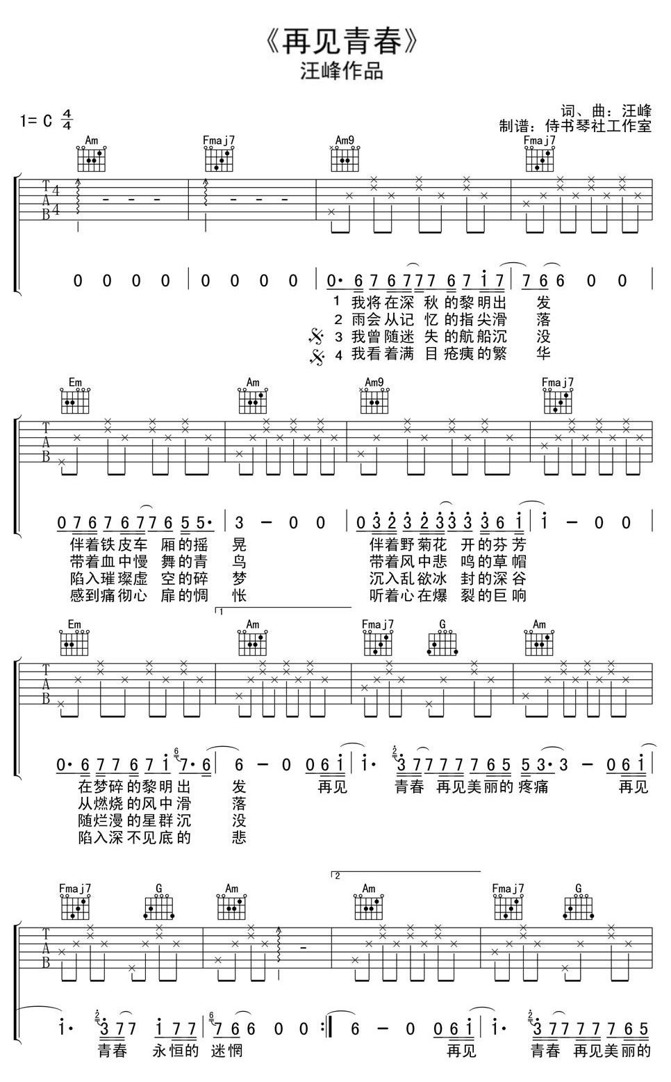 吉他汪峰《再见青春》吉他谱_吉他弹唱谱_侍书琴社编配