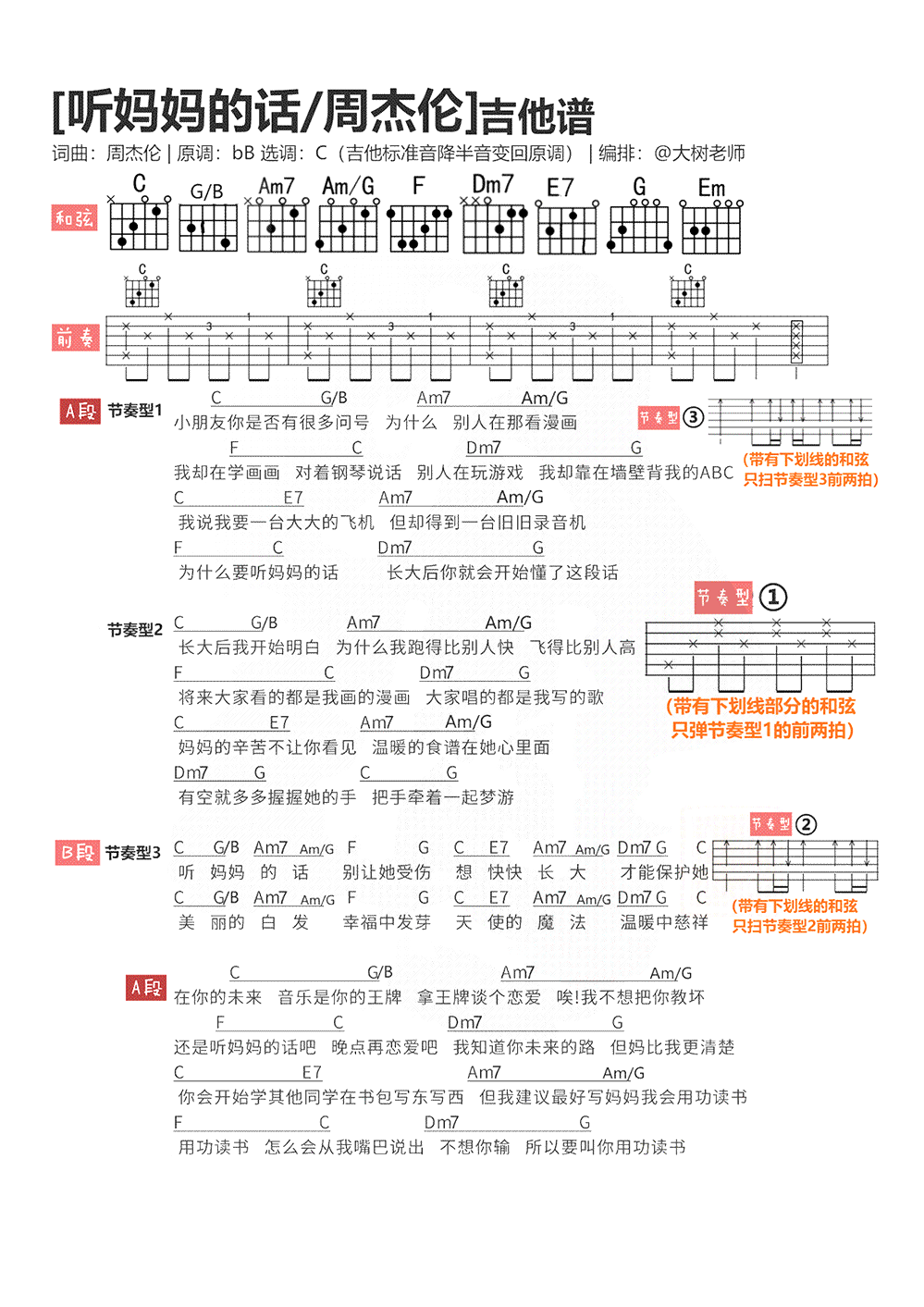 吉他周杰伦《听妈妈的话》吉他谱_吉他弹唱谱_大树乐器编配