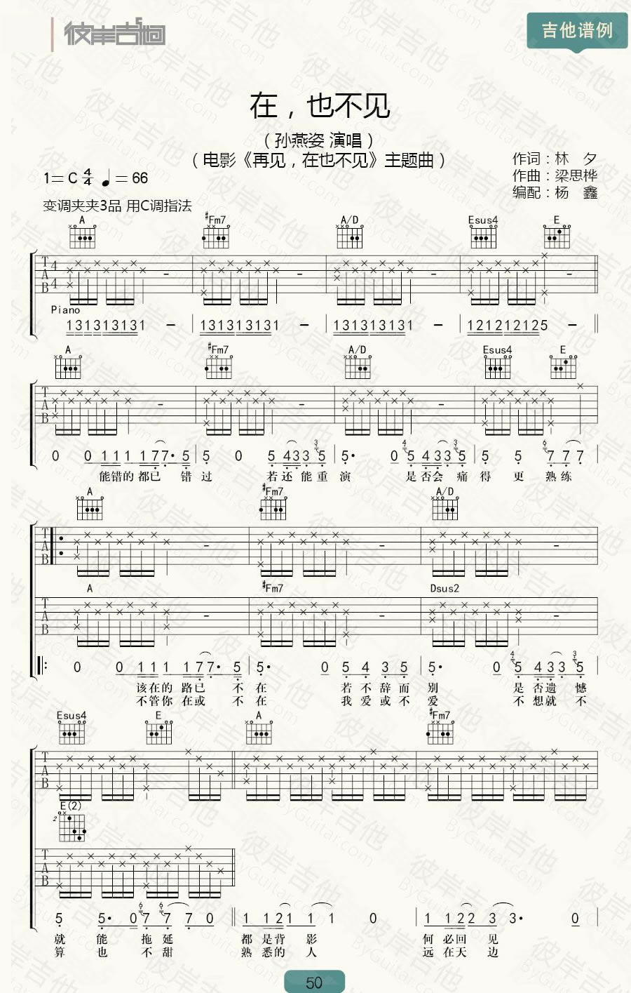 吉他孙燕姿《在也不见》吉他谱_吉他弹唱谱_杨鑫编配