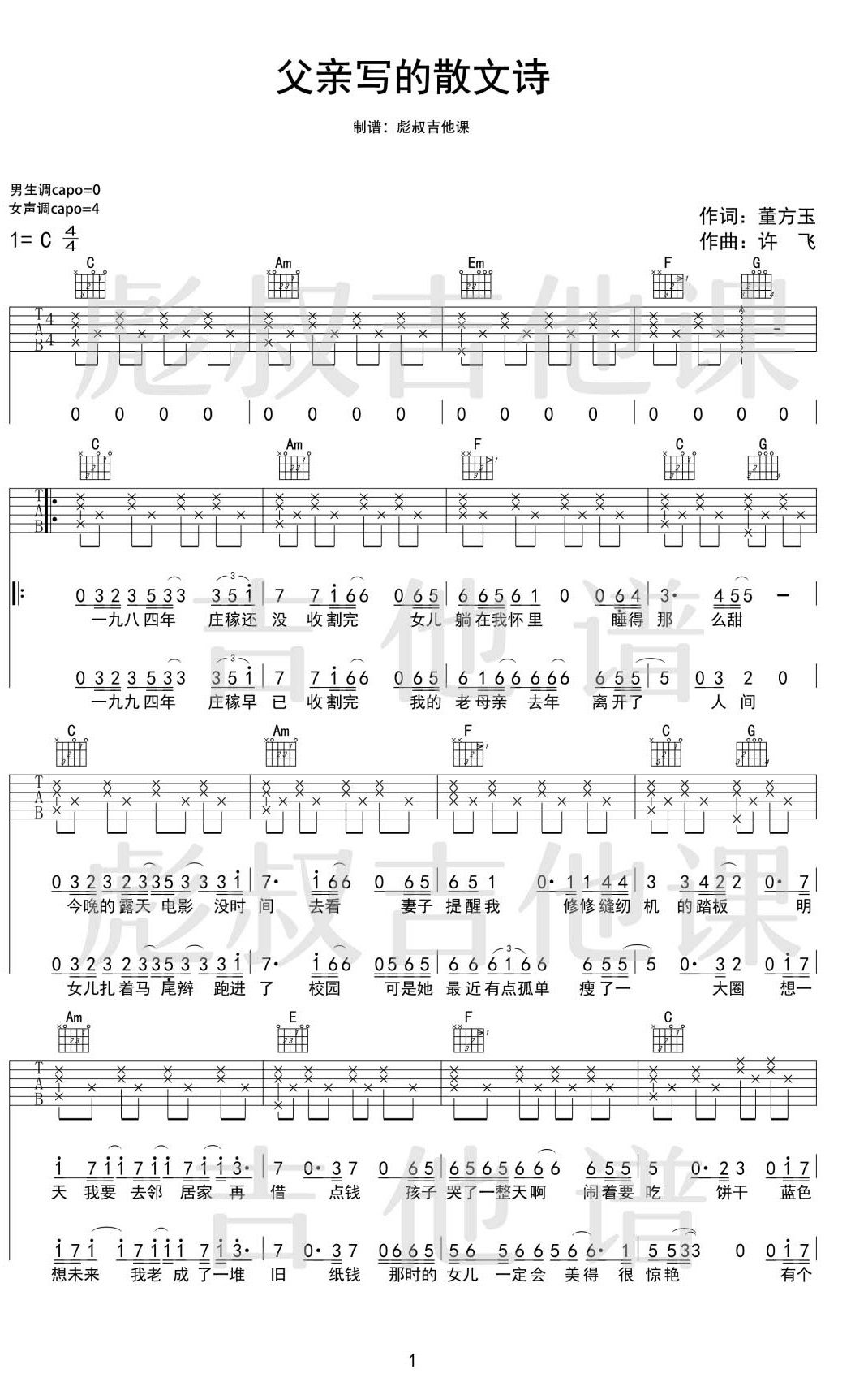 吉他许飞《父亲写的散文诗》吉他谱_吉他弹唱谱_彪叔吉他课编配