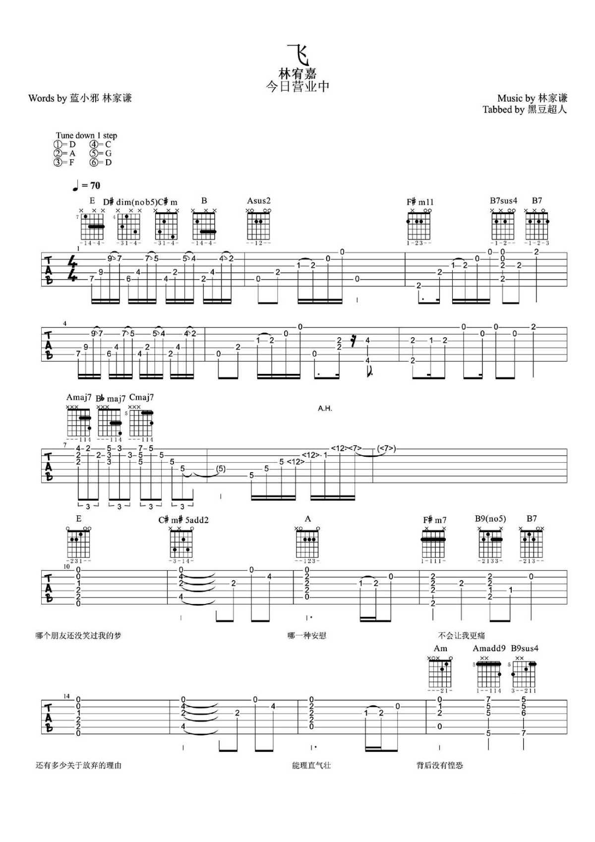 吉他林宥嘉《飞》吉他谱_吉他弹唱谱_黑豆超人编配