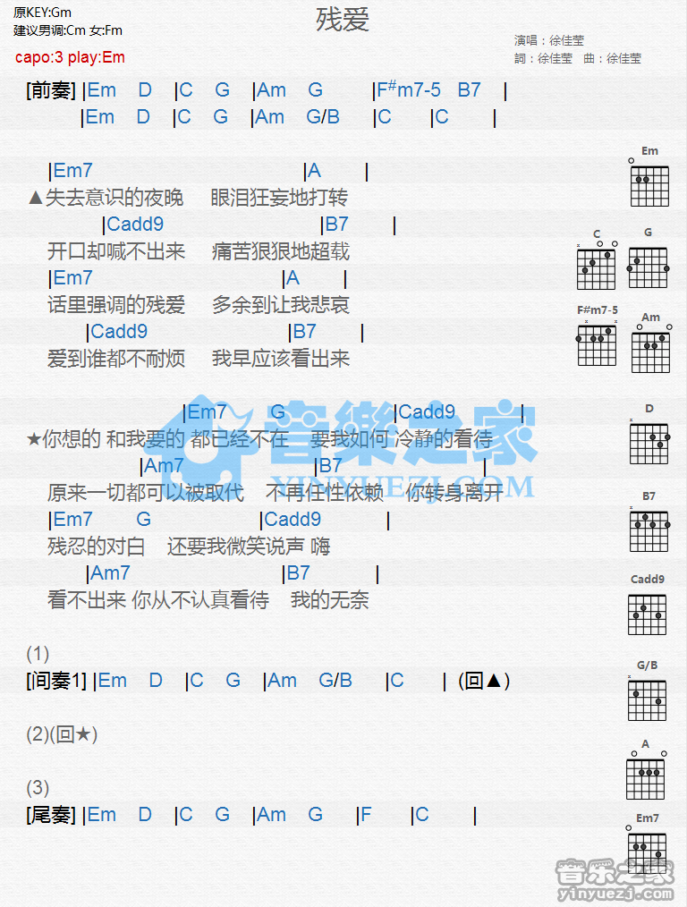 Em调版徐佳莹《残爱》吉他和弦弹唱谱...