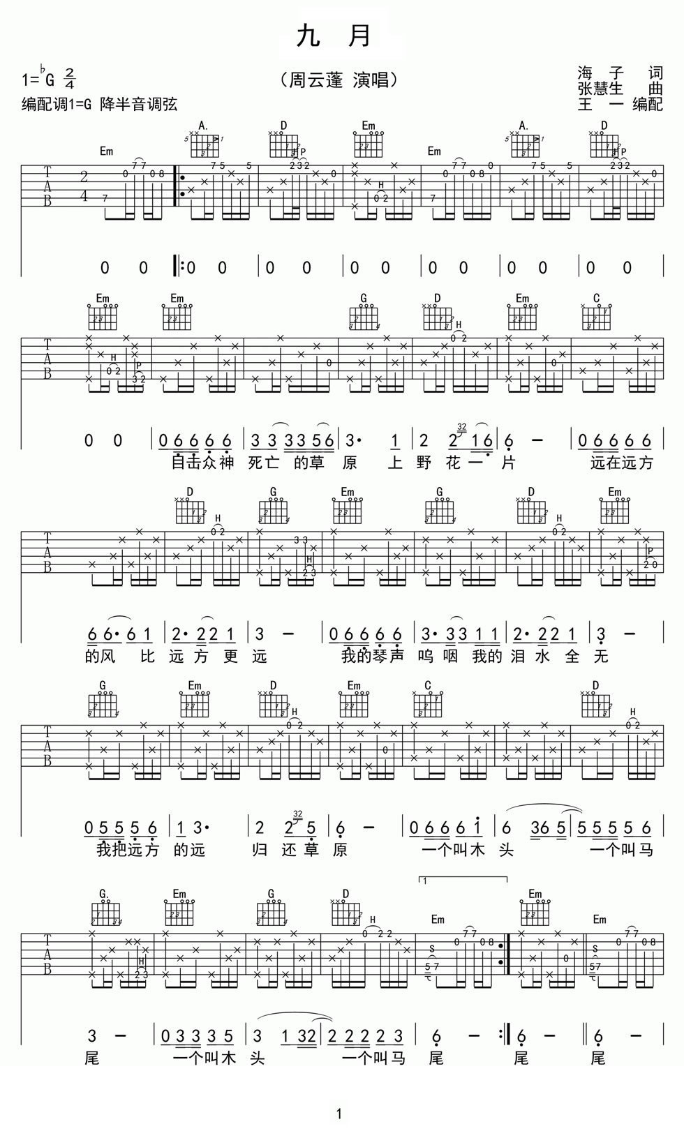 吉他杨山/周云蓬《九月》吉他谱_吉他弹唱谱_王一编配