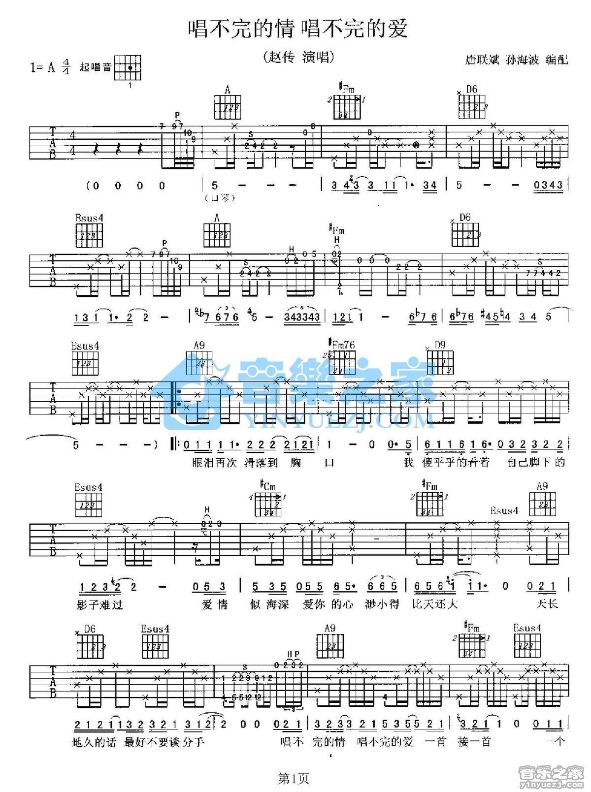 吉他赵传《唱不完的情唱不完的爱》吉他谱_吉他弹唱谱