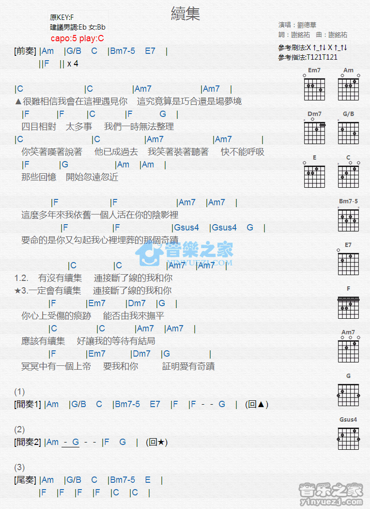 C调版刘德华《续集》吉他和弦弹唱谱...