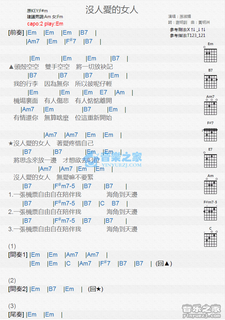 Em调版孙淑媚《没人爱的女人》吉他和弦弹唱谱...