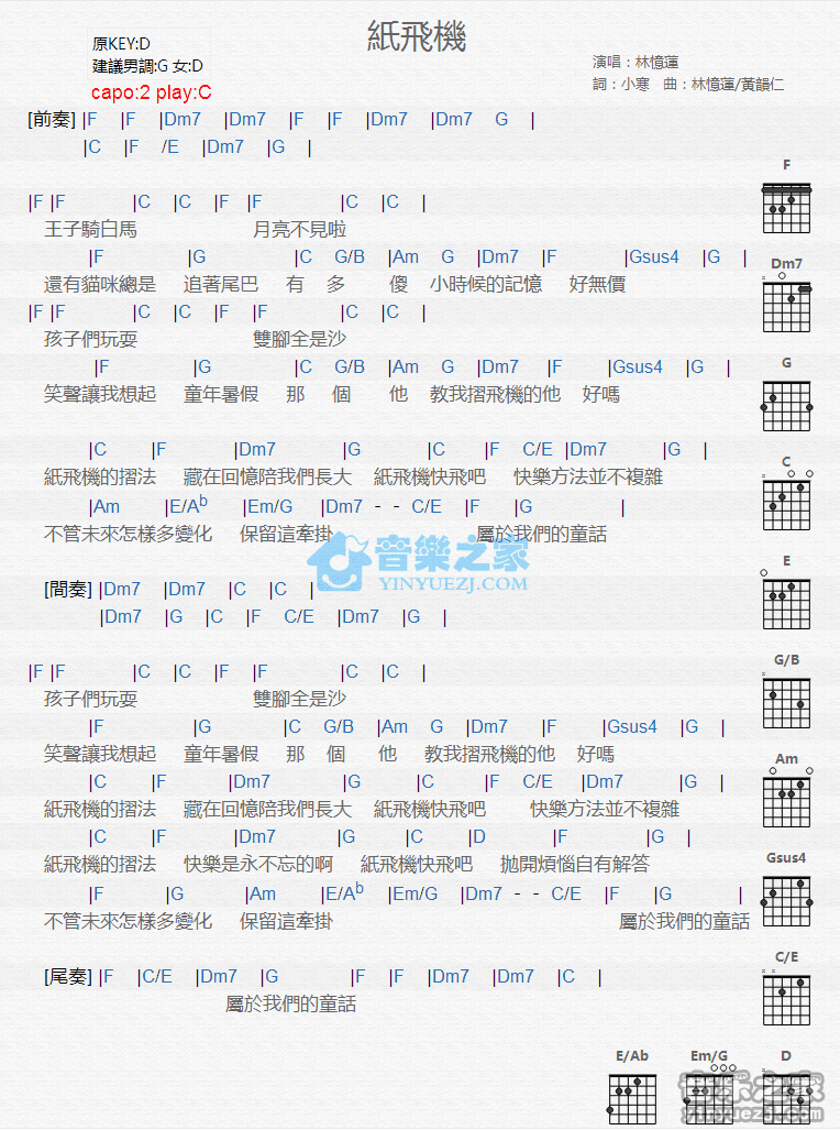吉他林忆莲《纸飞机》吉他谱_吉他弹唱谱_YYZJ编配
