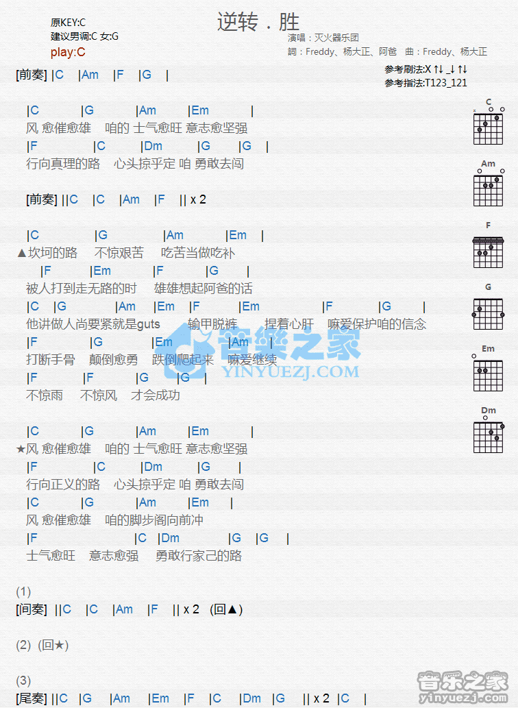 C调版灭火器《逆转胜》吉他和弦弹唱谱...