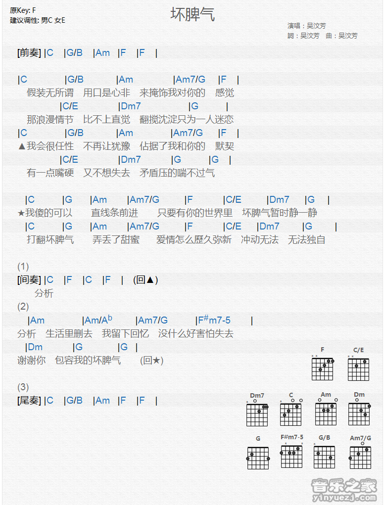 吉他吴汶芳《坏脾气》吉他谱_吉他弹唱谱_YYZJ编配