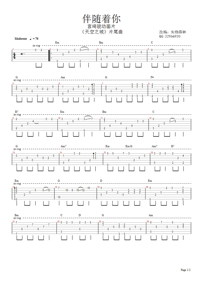 吉他宫崎骏《伴随着你》吉他谱_吉他弹唱谱_失物森林编配