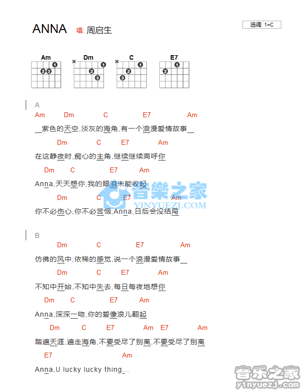 C调版周启生《ANNA》吉他和弦弹唱谱...