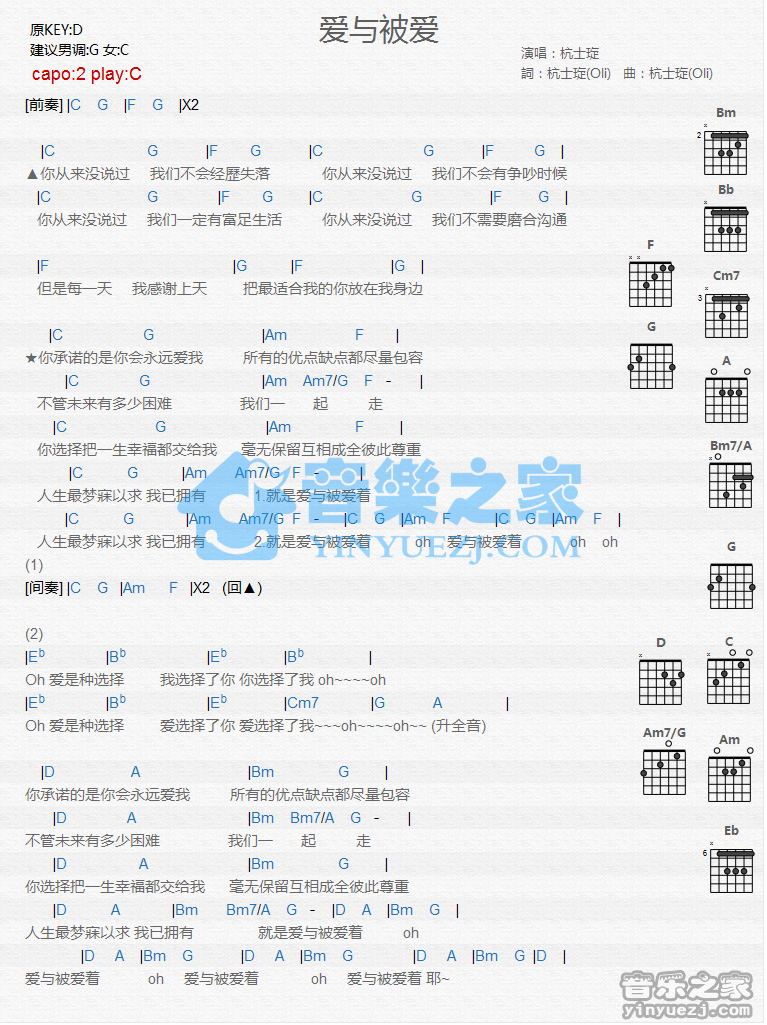 吉他杭士琁《爱与被爱》吉他谱_吉他弹唱谱_YYZJ编配
