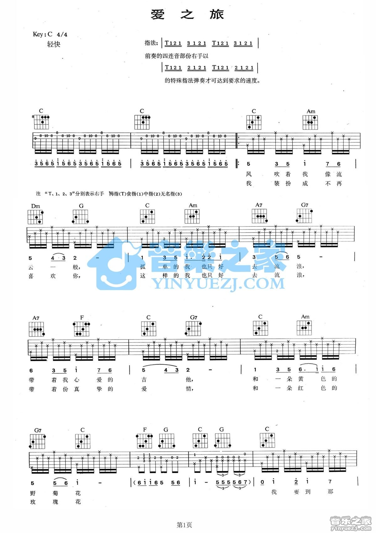 C调版侯湘婷《爱之旅》吉他弹唱六线谱...