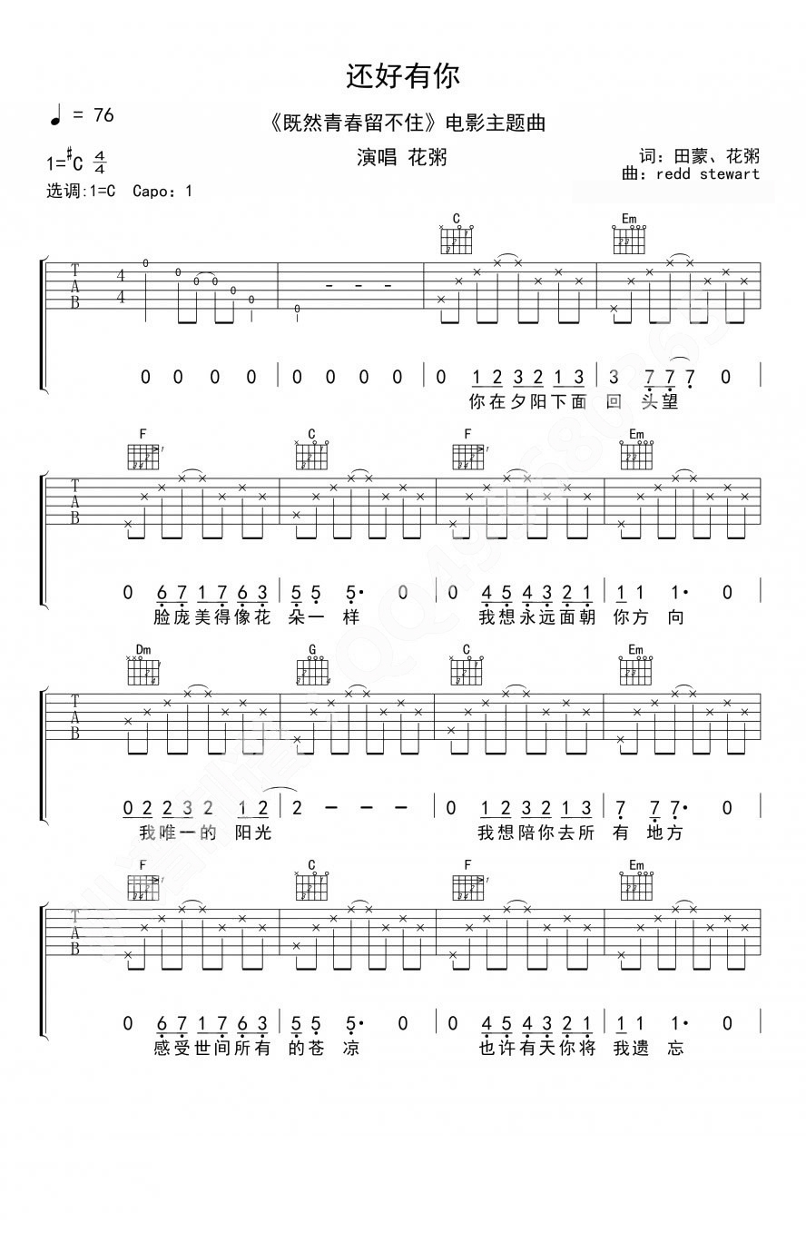 花粥《还好有你》吉他谱,电影《既然青春留不住》主题曲,选调C,CAPO夹一品。不一样的花粥粥大爷,一样温暖人心的《还好有你》,既然青春留不住,就抱着吉他一路弹弹唱唱走下去吧。...