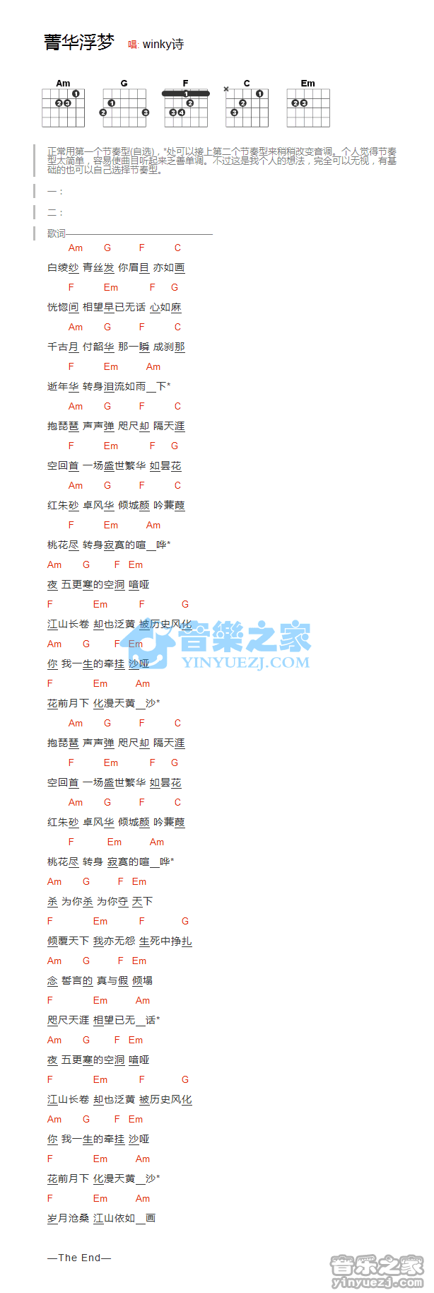 Winky诗《菁华浮梦》吉他和弦弹唱谱...