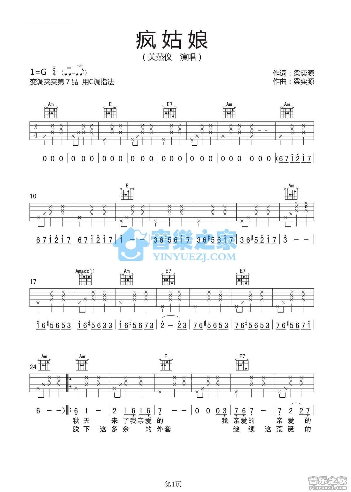 吉他关燕仪《疯姑娘》吉他谱_吉他弹唱谱