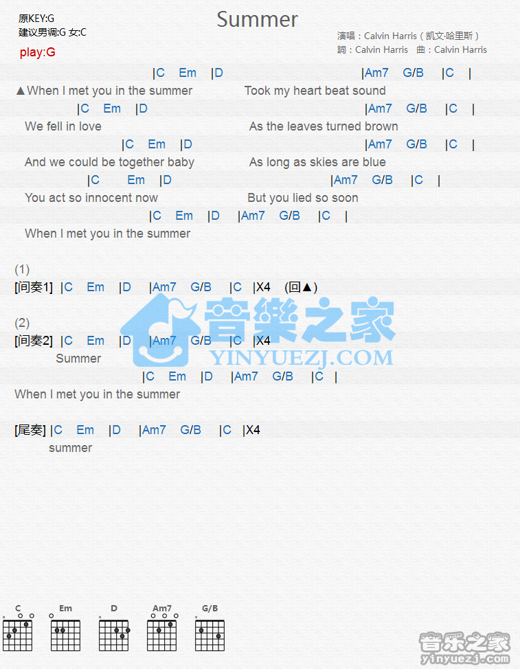 吉他CalvinHarris《Summer》吉他谱_吉他弹唱谱_YYZJ编配