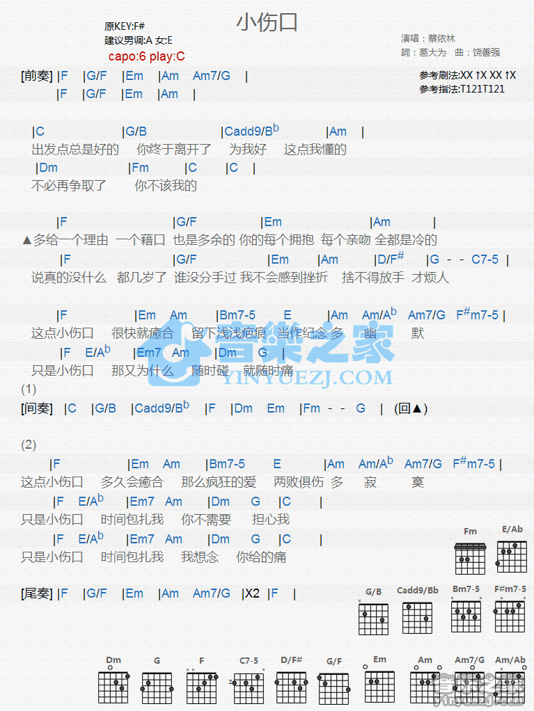 C调版蔡依林《小伤口》吉他和弦弹唱谱...