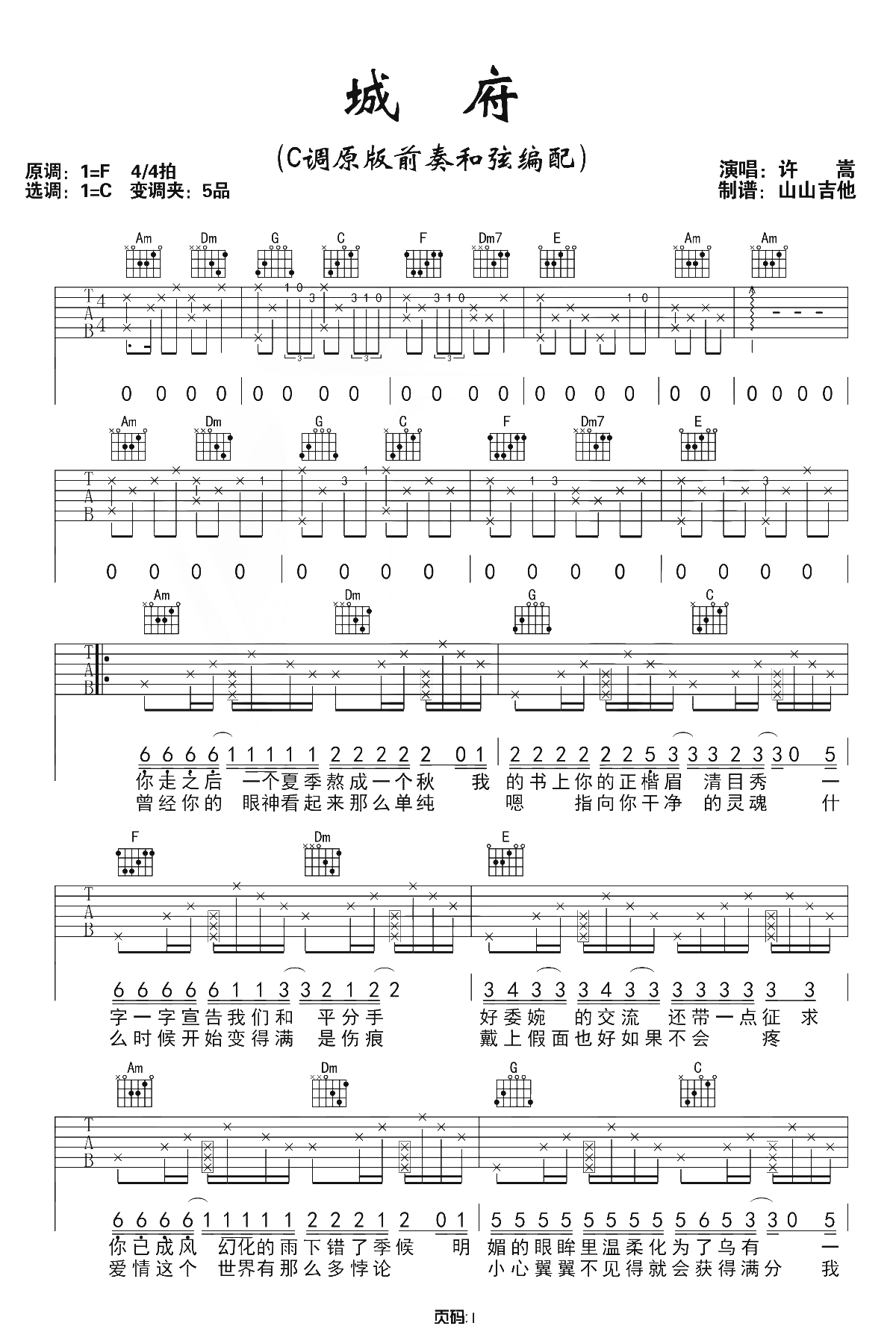 吉他许嵩《城府》吉他谱_吉他弹唱谱_山山吉他编配