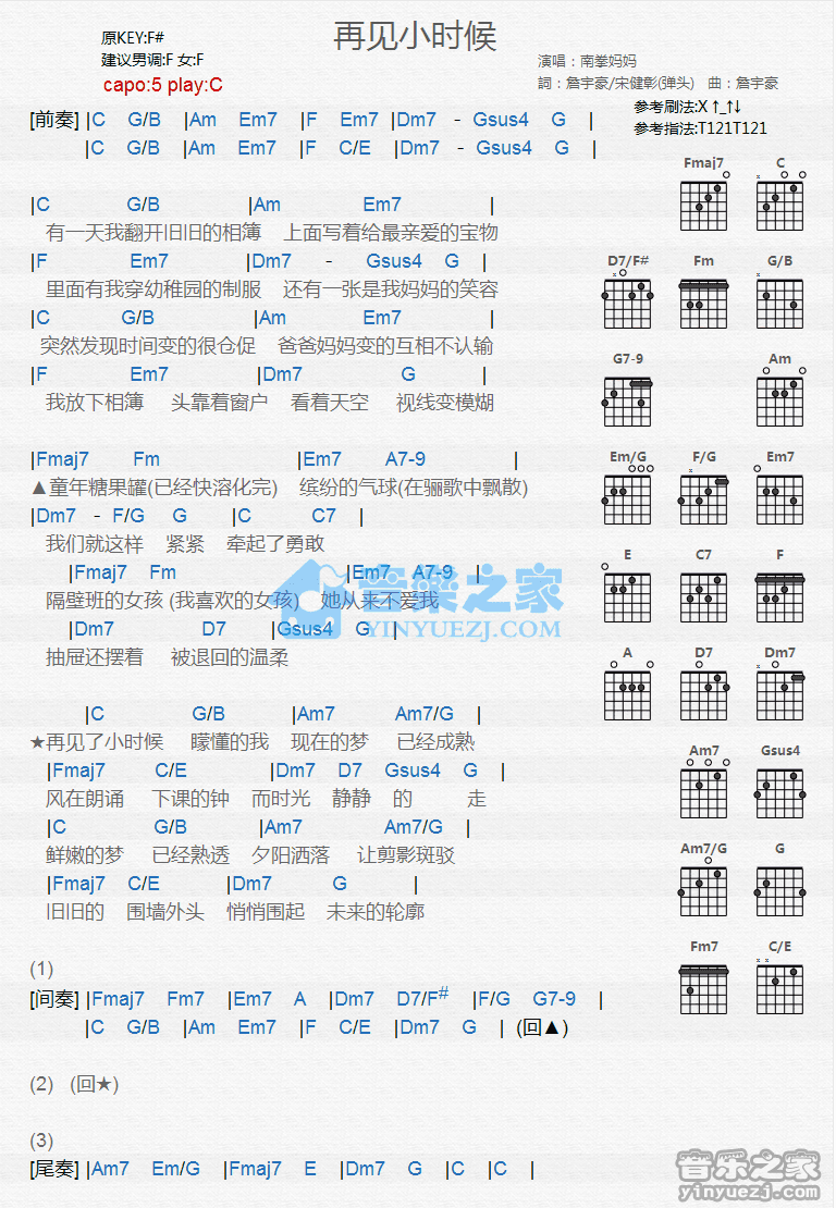 C调版南拳妈妈《再见小时候》吉他和弦弹唱谱...