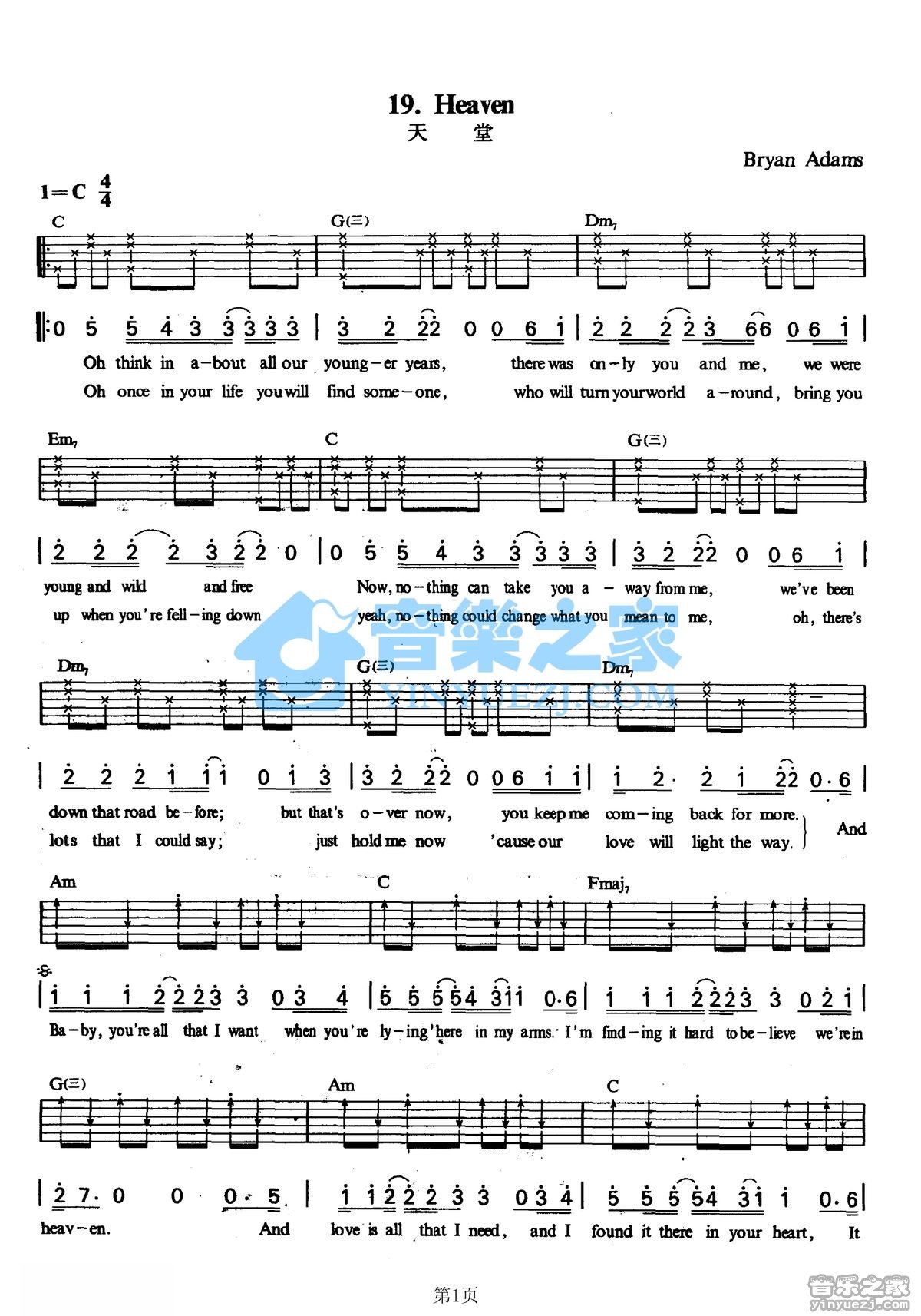 C调版BryanAdams《Heaven》吉他弹唱六线谱...