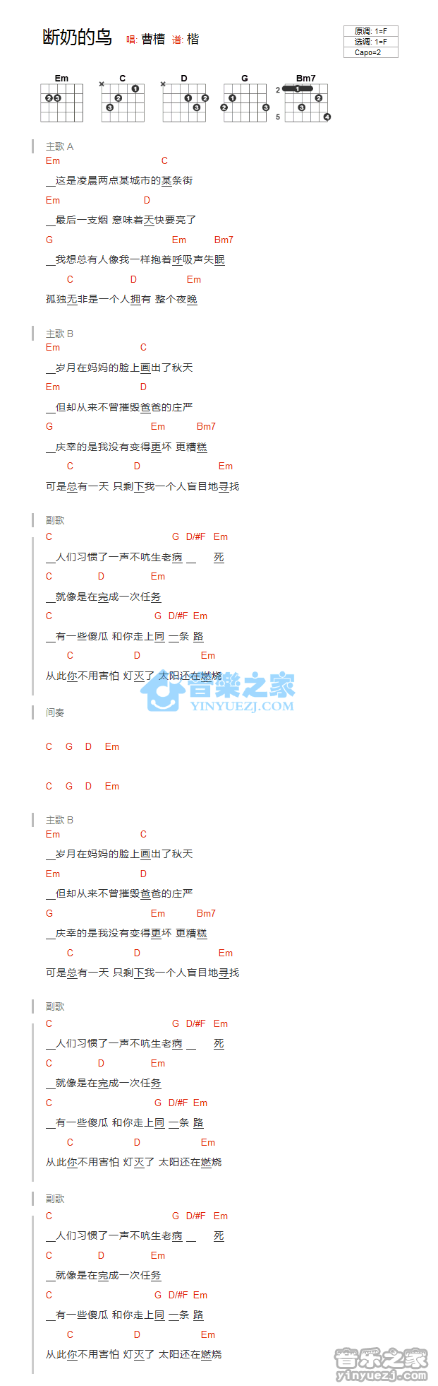 F调版曹槽《断奶的鸟》吉他和弦弹唱谱...
